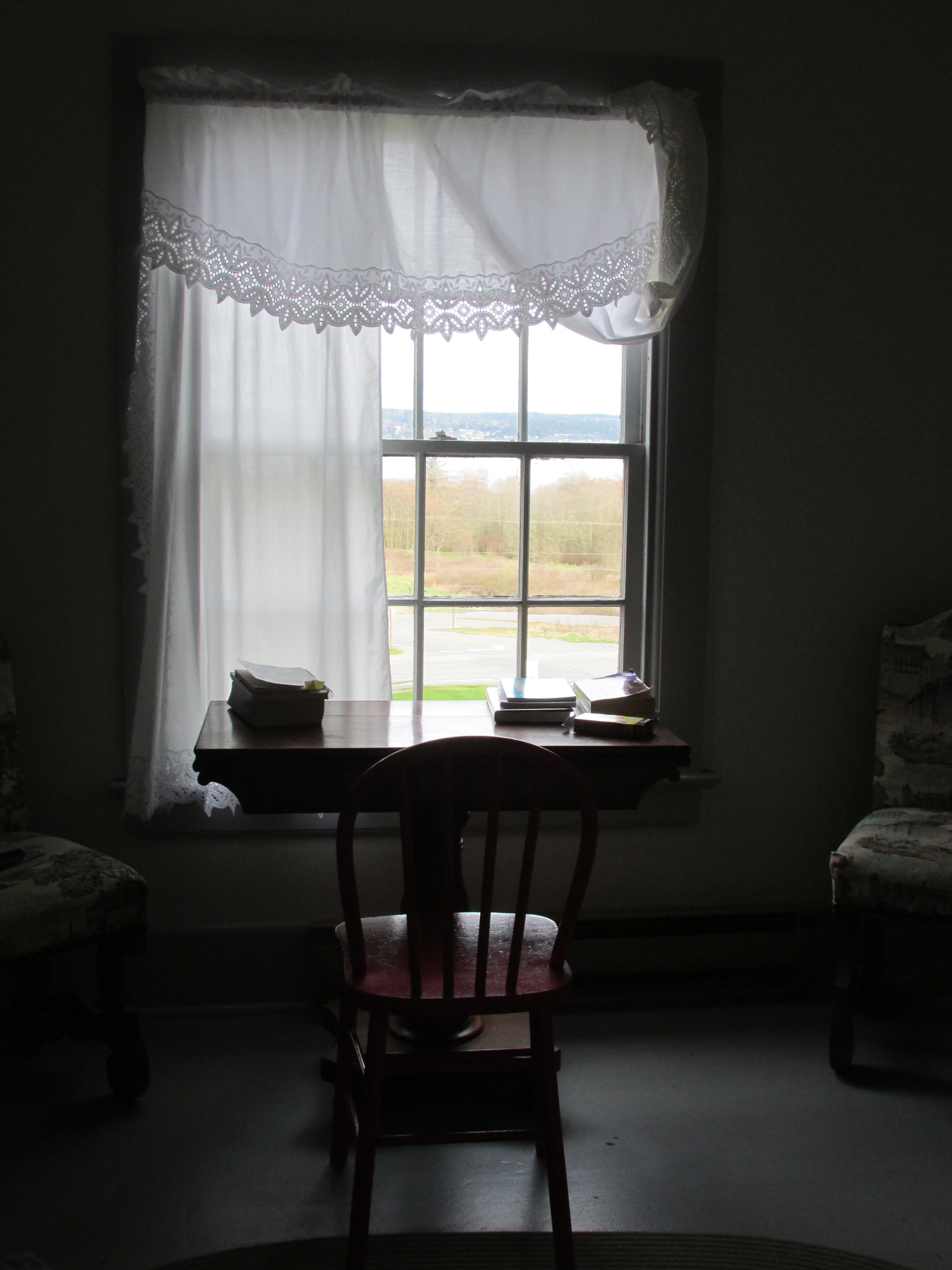 A small wooden table, a simple wooden chair, and a second-story window looking out over a body of water, green hills, trees. It’s tucked away, and no one can see me in the window, when I look up from the page.